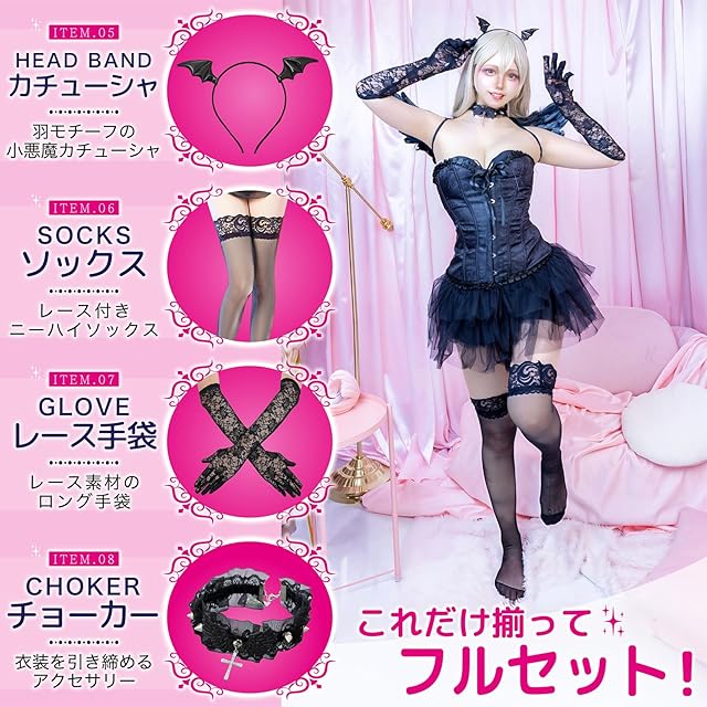 とにかく盛れる☆かわいいとセクシーを詰め込んだ、天使&悪魔コスチュームが登場! コルセットは後ろの紐で編み上げるタイプなので、体型に合わせてサイズ調整が可能。ウエストをキュッと引き締め、スタイルアップを叶えます。 スカートはふわふわのパニエ仕様。短め丈とたっぷりのボリューム感で、美脚効果も抜群!さらに、一番の魅力はレースフリル付きのペチコート。どんなポーズでも下着が見えない安心設計で、テーマパークやイベントでも気兼ねなく楽しめます。レースはパニエスカートと自然に馴染み、ボリュームアップ効果もプラス。日常使いにも活躍する万能アイテムです。 【セット内容】 トップス/パニエスカート/レースペチコート/カチューシャ/羽/ニーハイソックス/レース手袋/チョーカー ※天使セットにはさらに魔法の杖付き! 友達とお揃いで天使と悪魔になれば、写真映え&楽しさ倍増です!!