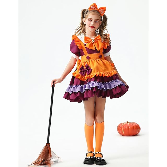 この可愛らしいメイド服セットは、子供のハロウィンやコスプレに最適です。かぼちゃモチーフのワンピースは、オレンジと紫の色合いが素敵で、フリルやリボンのデザインがとてもかわいらしい雰囲気を醸し出しています。半袖のデザインで、エプロンとカチューシャも付属しています。お子様の華やかな演出服として、また、パーティーやイベントでも目を引く存在になることでしょう。