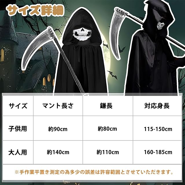 セット内容: マント、マスク、手袋、鎌の4点セット。ハロウィンのコスプレにおススメの死神コスチュームトです。おもしろ怖いハロウィンの大定番・ホラー風のコスプレ衣装です。手軽に変身!全身スーツの着ぐるみタイプで、これだけで変身が可能です。