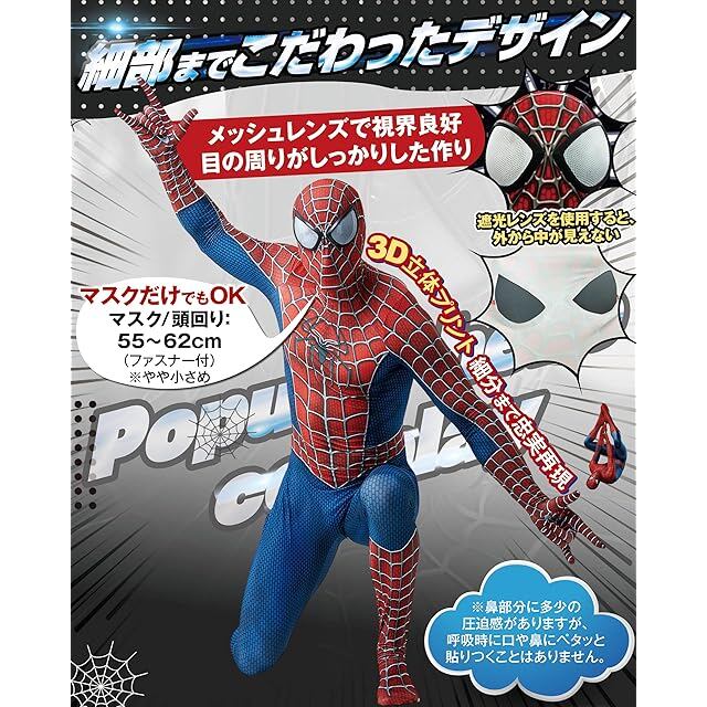 【スパイダーコスプレ・2点セット内容】 全身タイツ+分離式マスクの2点セット。付属品として蓄光タトゥーシール(ハロウィン用)1枚付き。155-190cmの身長に対応し、初心者でも簡単に着用可能。①頭部マスクとボディが分離式(セパレートタイプ) ②背中にロングファスナー付き(腰まで開閉可能) ③マスクにもファスナー装備で着脱が簡単 ④目の部分はレンズ付きで、メッシュ加工により視界を確保 ⑤足先から頭まで全身をカバー(靴着用可能)