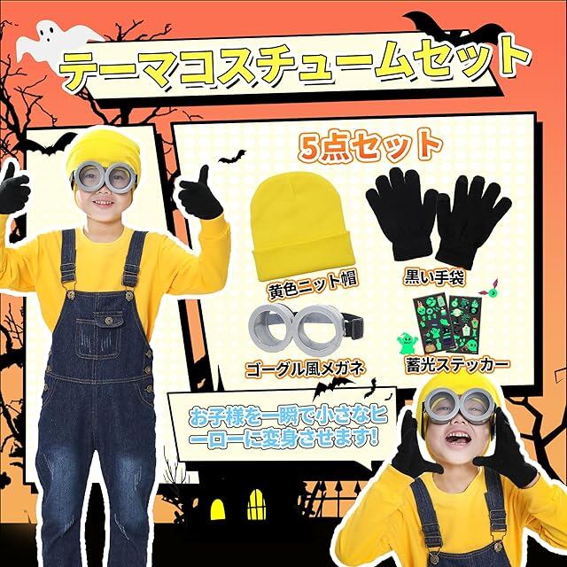 【5点セット内容】ハロウィン コスプレ風:ニット帽・ゴーグル風メガネ・ハロウィン専用の蓄光タトゥーシール2枚をお届けします、びのび手袋の5点セット!ハロウィン、イベント、パーティー、クリスマスなどでフル活用いただけるセットアップ商品。 ハロウィン コスプレ 子供、男の子も女の子も着て頂けます!ギフト・プレゼントにも喜ばれます。