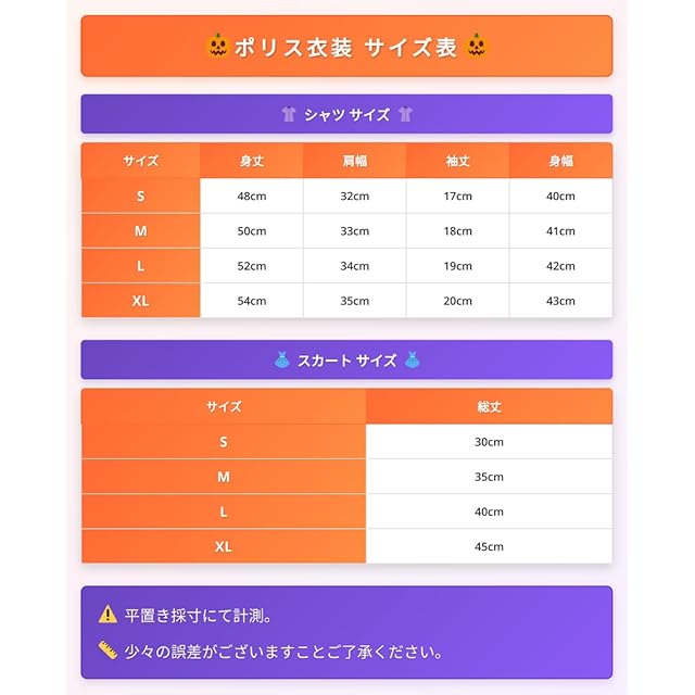 【Sサイズ】: シャツ:身丈48cm、肩幅32cm、袖丈17cm、身幅81cm/スカート:総丈30cm、ウェスト52-72cm 【Mサイズ】: シャツ:身丈50cm、肩幅33cm、袖丈18cm、身幅82cm/スカート:総丈35cm、ウェスト57-77cm 【Lサイズ】: シャツ:身丈52cm、肩幅34cm、袖丈19cm、身幅83cm/スカート:総丈40cm、ウェスト60-80cm 【XLサイズ】: シャツ:身丈54cm、肩幅35cm、袖丈20cm、身幅85cm/スカート:総丈45cm、ウェスト65-85m