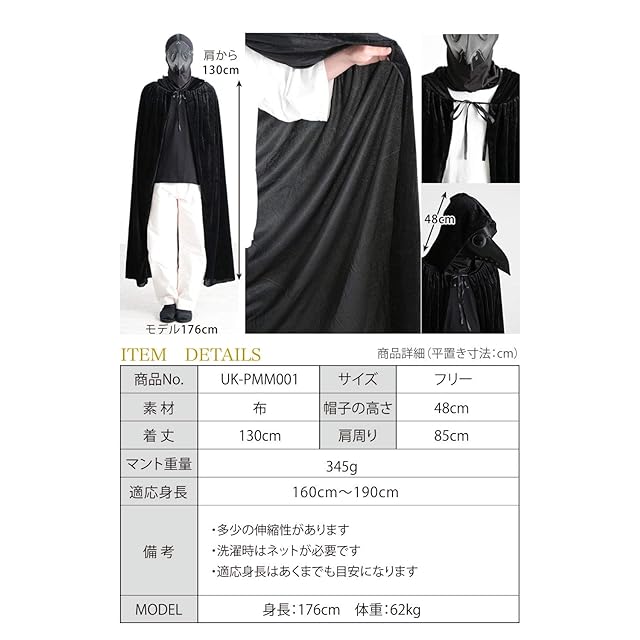 充実の付属品:目出し帽マントセットで注目度アップ、誰でも簡単にペスト医師を再現できます。