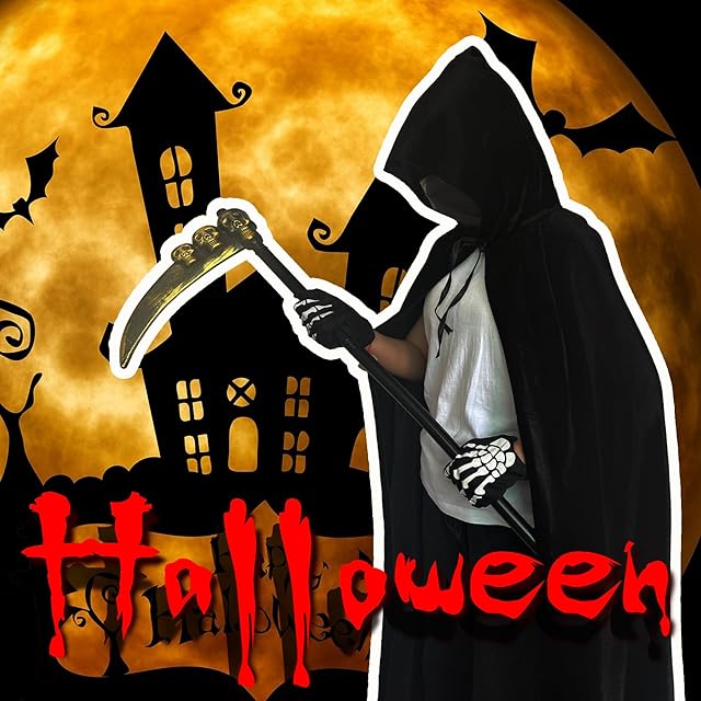 豪華4点セット:①ハロウィンマント 、② 鎌(かま)、③フェイスマスク、④骨柄の手袋