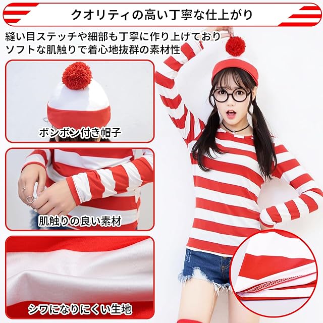 【デザイン性】定番の赤と白のボーダーデザイン。ウォーリのコスチュームは万人ウケする仮装です。