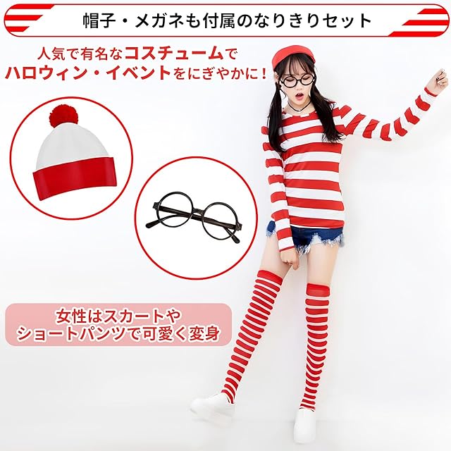【大人気ハロウィンコスプレ】今年も人気のウォーリーコスプレ。人気のキャラクターにすぐに変身できます♪ 【伸縮性のある素材】ロングTシャツは伸縮性がありどんな体型でもフィットしやすいです。また、シワも付きにくくイベントにぴったりです。 【デザイン性】定番の赤と白のボーダーデザイン。ウォーリのコスチュームは万人ウケする仮装です。 【セット内容】メンズ:ロングTシャツ・帽子・丸メガネの3点セット。レディース:ロングTシャツ・ニーハイソックス・帽子・丸メガネ 【サイズ】メンズMサイズ 着丈65cm、胸囲95cm、袖丈61cm 参考体重62-70kg 参考身長165-173cm メンズLサイズ 着丈67cm、胸囲98cm、袖丈64cm 参考体重68-76kg 参考身長172-180cm。レディースMサイズ 着丈62cm、胸囲80cm、袖丈55cm 参考体重44-52kg 参考身長150-158cm レディースLサイズ 着丈64cm、胸囲83cm、袖丈57cm 参考体重50-58kg 参考身長156-164cm
