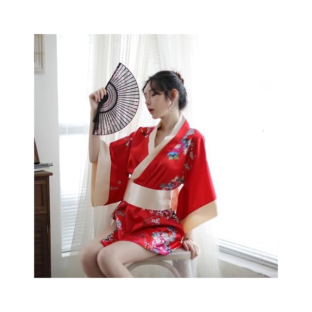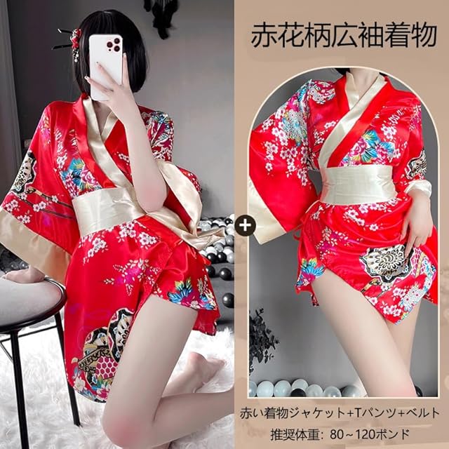 [Coaroly] 着物 ミニドレス 浴衣 3点セット コスプレ セクシー 花魁 着物 和装 パジャマ 女性 花柄 和装 下着 人気 コスプレ キャバクラ ドレス ショートバスローブ (赤い花)