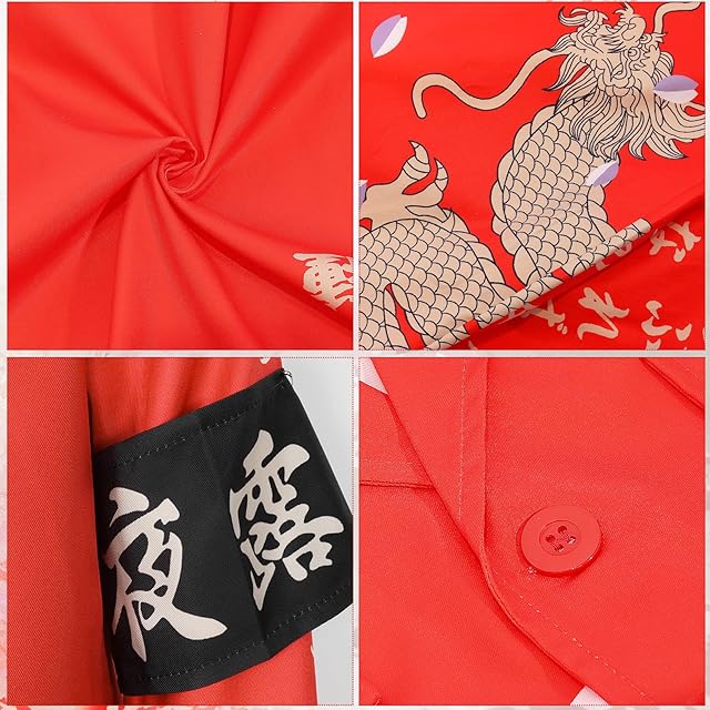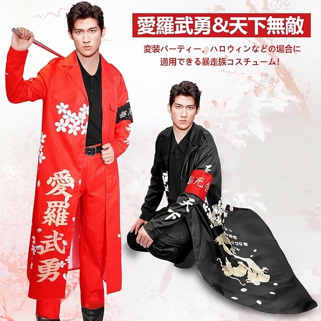 <p>製品名: 天下無敵 特攻服 フルセット</p> <p>セット内容: 特攻服コート、ズボン、ベルト、夜露死苦デザイン腕章 (計4点)</p> <p>カラー: レッド、ブラック (2色展開)</p> <p>サイズ: S、M、L、XL (男女兼用サイズ)</p> <p>対応性別: 男性 (メンズ)、女性 (レディース) 兼用</p> <p>主素材: 高品質ポリエステル</p> <p>特徴: 立体感のあるプリントデザイン 、通気性良好、柔らかく着心地良い</p> <p>主なデザイン要素:</p> <p>コート前面: 「龍」デザイン + 「愛羅武勇」文字</p> <p>コート背面: 「天下無敵」文字</p> <p>左袖: 「天下無敵」文字</p> <p>右袖: 「唯我独尊」文字</p> <p>桜の花モチーフ アクセント</p> <p>二、 製品のここがすごい! (製品の売点・強み)</p> <p> 圧倒的「天下無敵」デザインでカッコよく決まる!</p> <p>人気アニメや暴走族文化を彷彿とさせる、「天下無敵」「愛羅武勇」「唯我独尊」 の覇気あふれる文字と、迫力の 「龍」 モチーフをコート前面・背面・両袖に大胆プリント。細部に散りばめられた 桜 のアクセントが、侠客(きょうかく)の 「仁義」 とロマンを感じさせ、一目で存在感を放つ 特攻服 です。ハロウィンやイベントで絶対の注目を集めます!</p> <p> フル4点セットでコスプレがすぐに完結!</p> <p>コート、ズボン、ベルト、そして欠かせない 「夜露死苦」 デザインの腕章まで、暴走族コスプレ に必要なアイテムが 全て揃った4点セット。面倒な別途準備は不要で、届いたその日から本格的な仮装が楽しめます。ハロウィン特攻服 としてすぐに使える便利さが魅力です。</p> <p> 男女兼用 & 4サイズで幅広くフィット!</p> <p>メンズ はもちろん、レディース にも人気の 男女兼用 デザイン。S~XLの4サイズ を展開しているので、様々な体型の方にお選びいただけます。カップルや友達同士での 「暴走族コンビ」コスプレ も実現可能!肩幅とウエストを測って、ご自身にぴったりのサイズをお選びください。</p> <p> 着やすさと見た目を両立した高品質素材!</p> <p>肌触りが良く、通気性に優れた高品質ポリエステル 素材を採用。長時間のパーティーやイベントでも蒸れにくく、快適 に着用できます。プリント部分は立体感を出すため、軽くアイロンをかけるとさらにデザインが引き立ちます。見た目の迫力だけでなく、着心地の良さ にもこだわりました。</p> <p> コスパ抜群!シーンを選ばず大活躍!</p> <p>本格的なデザインでありながら、フルセット でお求めやすい価格を実現。ハロウィンやクリスマスの 仮装パーティー はもちろん、学園祭、文化祭、応援団コスプレ、誕生日会、テーマパーク訪問、記念撮影、演劇の衣装など、様々なイベントやコスプレシーンで活躍。思い出作りに最適な コスプレ衣装 です。</p> <p>三、 こんな時に、こんな風に使える! (使用シーン・活用方法)</p> <p> ハロウィン仮装の主役に!: 定番でありながら常に注目を集める 「暴走族特攻服」 コスプレで、ハロウィンパーティーや街歩きを圧巻!個性的でカッコいい仮装を実現します。まさに 「ハロウィン特攻服」 の決定版。</p> <p> クリスマスパーティーのサプライズ衣装に!: クリスマスも仮装で盛り上がろう!普段とは違う「天下無敵」の姿で、サプライズ効果抜群。楽しい思い出作りを演出します。</p> <p> 学園祭・文化祭の出し物や装いに!: 演劇部の衣装や、文化祭の展示、はた</p>