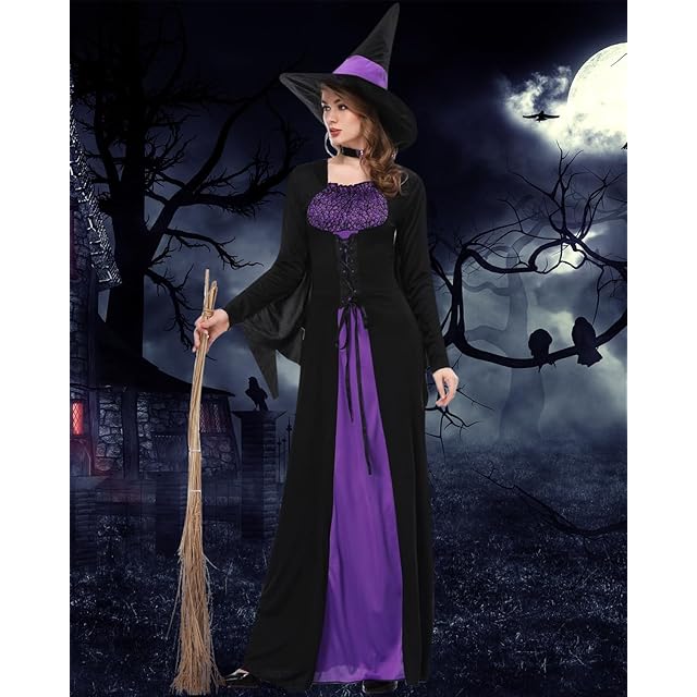 [akaien] ハロウィン 魔女 コスプレ 衣装 レディース 大人 ワンピース ドレス 大きいサイズ 魔女 仮装 コスチューム 魔法使い ウィッチ 3点セット 紫 M