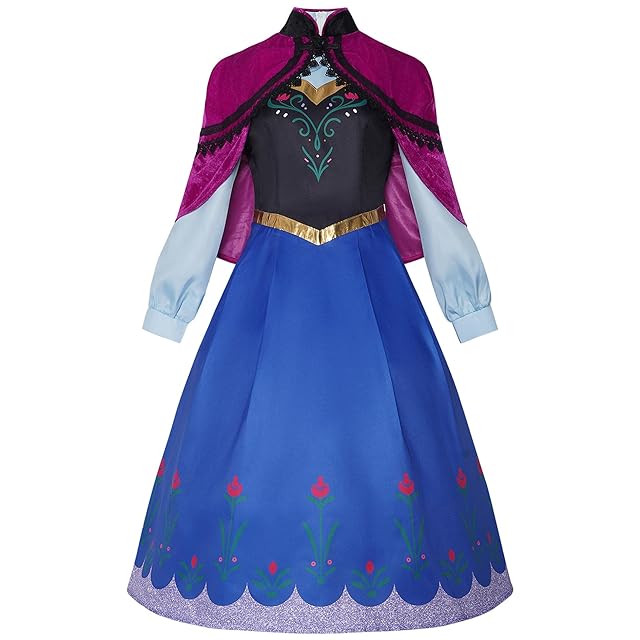 【豪華なディテール】:鮮やかな青のスカートにエレガントな刺繍風のデザインが施され、さらに鮮やかなマゼンタのケープがアクセント、完璧なパーティーやイベントのコスチュームです
