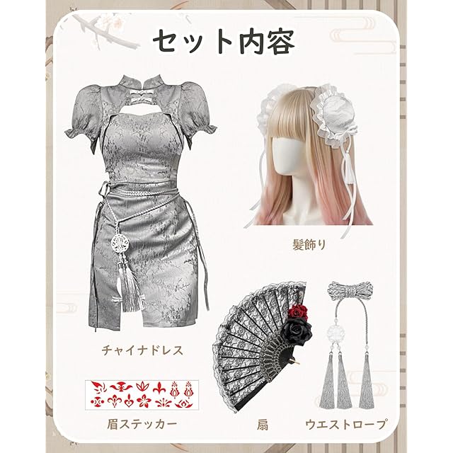 ロリータ 制服】セット:チャイナドレス + 扇子 + ヘアアクセサリー + ステッカー。【本品は全体的にコンパクトなシルエットのため、お客様の普段のご利用サイズよりワンサイズ上のご購入をお勧めしております。サイズ表の実寸(cm)を普段着用のお衣服と比較頂くとより確実です】JIURUN は商標登録済の日本ブランド。