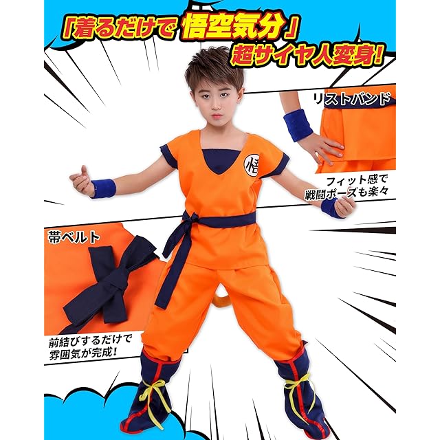 ■【豪華7点セット!コスチューム】<br/> トップス<br/> ・バンツ(ウエストゴム)<br/> ・帯ベルト(前結び可能)<br/> ・戦闘用リストバンド×2<br/> ・取り外し可能なしっぽ(クリップ式)<br/> ・シューズカバー×2<br/> ・蓄光タトゥーシール×1枚<br/> ■<br/> ①トップスはオレンジ道着!<br/> ➁バンツはウエストゴム仕様軽量動きやすい<br/> ③しっぽはピン留め式でズレにくく、変身後も邪魔になりません♪<br/> ④リストバンドはフィット感◎で戦闘ポーズも楽々<br/> ⑤帯ベルトは前結びするだけで雰囲気が完成!<br/> ⑥シューズカバー×2<br/> ⑦蓄光タトゥーシールで暗闇でも目立つ!<br/> ■【おまけ付き:ハロウィン専用蓄光タトゥーシール ×1枚】<br/> 特典のタトゥーシール1枚付き(昔ながらの水で肌に貼り付けるタイプ)。