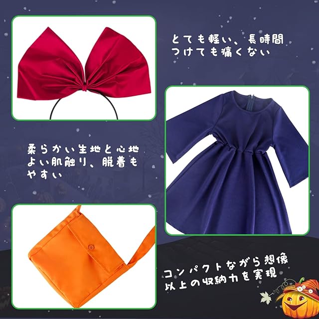 【セット内容】3点セット:リボンカチューシャ、ワンピース、ショルダーバッグ。アニメ映画「魔女の宅急便」キャラクター主人公キキのコスチュームです。原作をできるだけ忠実に再現できるように細部までこだわり設計、作成しまして、髪飾りやワンピース、ショルダーバッグも劇中のまま!
