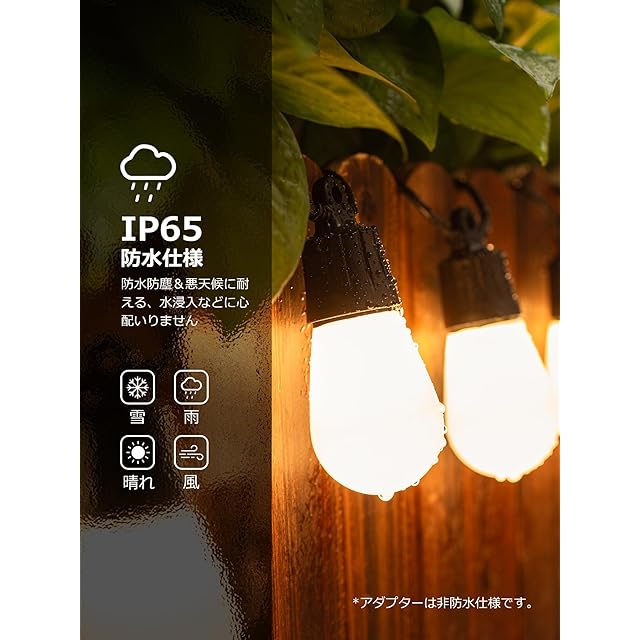 【コンセント式・IP65防水&屋内屋外兼用】イルミネーションライトの防水性能はIP65レベルで、いかなる角度からの水しぶきにも耐えられます(ご注意:アダプターには防水性がないため、水に当たらないようにご注意ください)。屋内での飾りはもちろん、屋外の庭、ガーデン、アウトドアシーンのキャンプ、テントなども飾り付けられ、雨や雪の日にも電飾の楽しみを味わえます。また、RGBW光色の電球が15M内15個配備され、幅広くデコレーション頂けます。割れない硬質プラ電球で、安心して持ち運びもできます。コンセント式で電源ケーブルの長さも十分で、給電と配線の心配もなく、お好きな所に装着可能。ぜひあなたのベッドルーム・庭先・キャンプライフのワンプラスにお試しください。