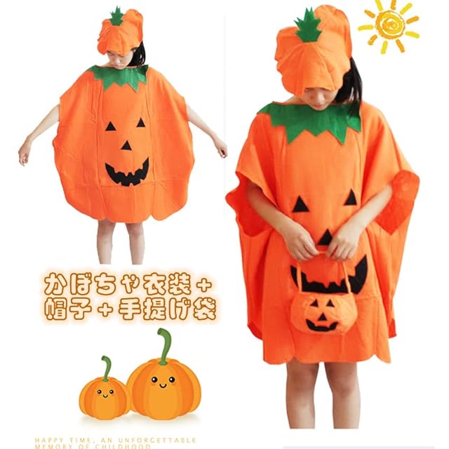 【かぼちゃコスプレ】超可愛いかぼちゃのコスチュームセットです。セット内容:かぼちゃ衣装+帽子+手提げ袋