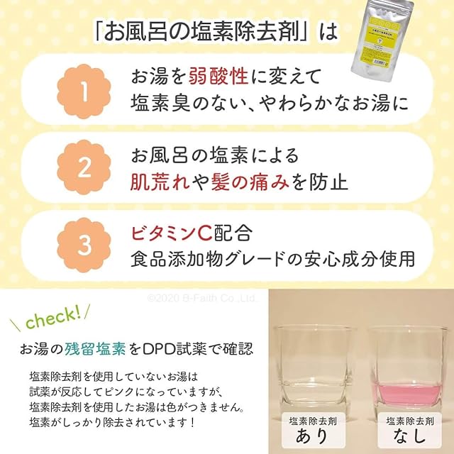 錠剤を1錠バスタブにいれるだけで塩素の無いまろやかなお湯になります。 塩素の刺激による肌荒れや髪のパサつきを防ぎます。 1回1錠で、90日分のお得な大容量タイプです。 3セットなので、合計270日分です。 お湯を溜めると同時に投入すれば、入るころには塩素の無いお風呂の完成です。 もちろん入浴剤との併用可能です。