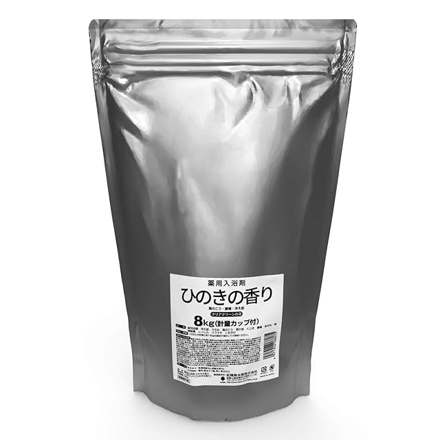 【たっぷり使える薬用入浴剤】 <br>なんと8kgの大容量!業務用としてもお使いいただける、粉末タイプの入浴剤です。 <br>ほっとする檜(ひのき)の木の香りと、綺麗なクリアグリーンの湯色で、ゆったりとリラックス&リフレッシュできます。 <br>便利な計量カップ付きです。 <br> <br>【ヒノキの香りでリラックス】 <br>有用成分である、乾燥硫酸Na、炭酸水素Naが配合されているので、身体のコリ、冷え、あせもなどに効果を発揮します。 <br>効能:うちみ・荒れ性・くじき・あせも・痔・リウマチ・しもやけなど。 <br> <br>【ご使用方法】 <br>1000リットルのお湯に、約130gの割合で溶かしてお使いください。 <br> <br>【ご使用上の注意】 <br>・本品には浴槽、風呂釜を傷めるイオウは入っておりません。 <br>・残り湯は洗濯にもお使いになれますが、すすぎは清水で行ってください。ただし、柔軟仕上剤との併用、おろしたての衣料、つけおき、白地のもの等には使用しないでください。 <br>・24時間保温など、循環式の風呂釜で使用しないでください。ろ過機(フィルター)が目詰まりしたり、浴槽、風呂釜を傷める場合があります。 <br> <br>【商品詳細】 <br>[内容量]8kg <br>[原産国]日本 <br>※医薬部外品