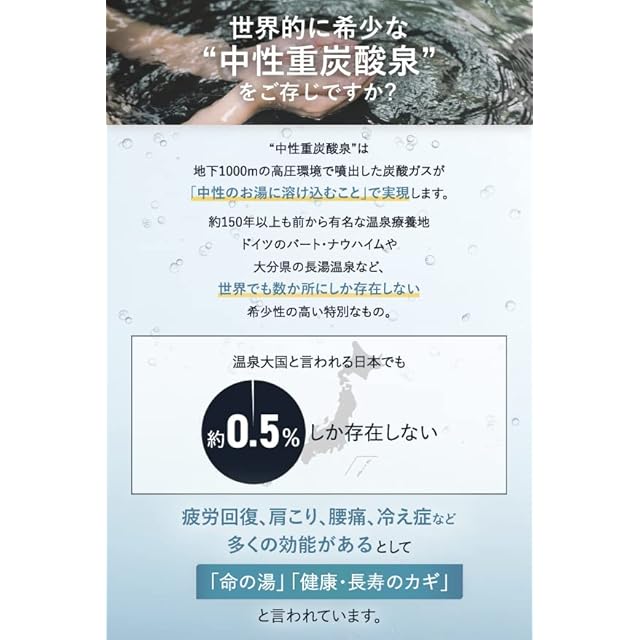 【ドイツの温泉源をテーマに】ドイツの自然炭酸源が中性pHであること、ぬるい温度のお湯にゆっくり長時間浸かる健康管理方の『重炭酸温浴法』を取り入れました。