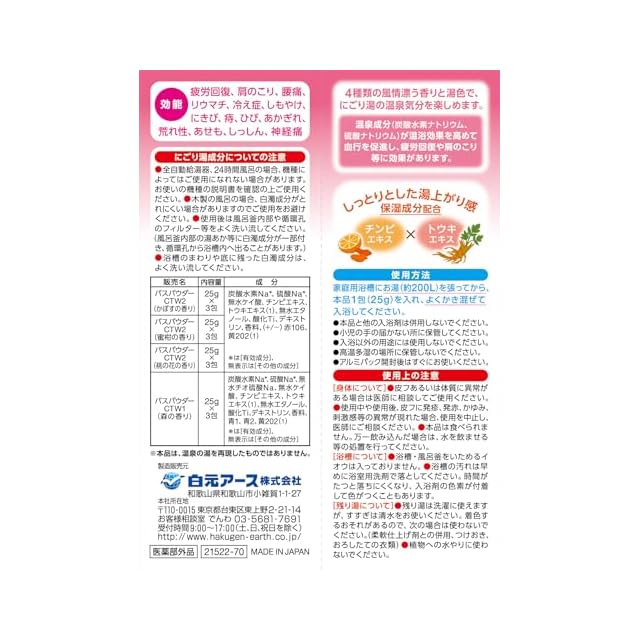 【医薬部外品】<br>販売名<br>・バスパウダーCTW2(かぼすの香り)<br>・バスパウダーCTW2(蜜柑の香り)<br>・バスパウダーCTW2(桃の花の香り)<br>・バスパウダーCTW1(森の香り)<br><br>【効能】<br>疲労回復、肩のこり、腰痛、リウマチ、冷え症、しもやけ、にきび、痔、ひび、あかぎれ、荒れ性、あせも、しっしん、神経痛 【使用方法】<br>家庭用浴槽にお湯(約200L)を張ってから、本品1包(25g)を入れ、よくかき混ぜて入浴してください。