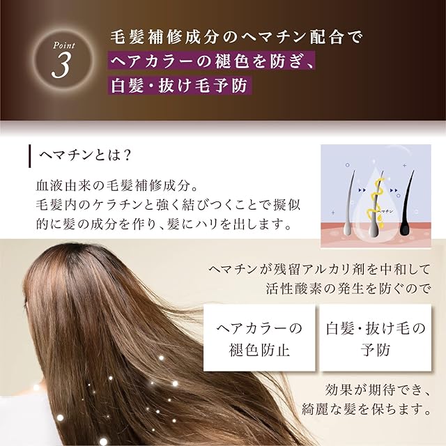 ✨【その他の有効成分は?】毛髪補修成分のヘマチン配合で、ヘアカラーの褪色防止に期待ができます。ヘマチンは血液由来の毛髪補修成分で、髪の毛の主成分であるケラチンと強く結びつくことで髪の毛にツヤとハリを与えます。ノンシリコンで、髪の毛と頭皮の乾燥やトラブルをケアする成分(ハチミツ/オリーブ果実油/ヒマシ油/シルク/コラーゲン/ケラチン)が配合されています。そしてアミノ酸系洗浄成分と植物由来洗浄成分で必要お油分を残し、保湿しながら優しく洗います。