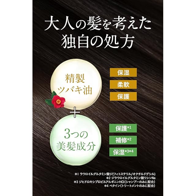 精製ツバキ油と3つの美髪成分配合で髪にハリコシツヤを与え、ボリューム感のある仕上がりに。