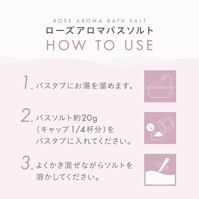 【バスソルトの使い方】1.バスタブにお湯をためます。2.バスソルト約20g(キャップ1/4杯)をバスタブに入れてください。3.よくかき混ぜながらソルトを溶かしてください。