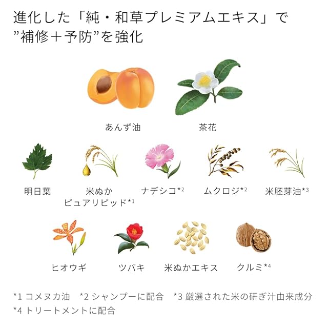 【絹髪に導く予防美髪成分】いち髪は日本女性の髪研究を重ね、髪と地肌にうるおいを与え、乾燥や摩擦などによる髪ダメージを補修&予防する成分「純・和草プレミアムエキス」を開発。さらに、ポリフェノール、アミノ酸、ビタミン類などの栄養素を含むといわれる「明日葉」エキスを配合し、ダメージ補修強化でしなやかさがアップ。