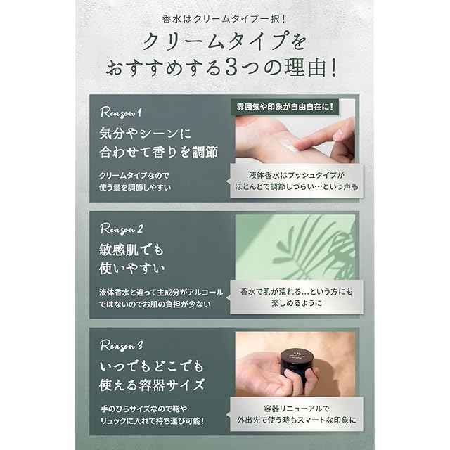 【クリームタイプで使いやすい】■香水と異なり、アルコール配合量が多くないので敏感肌にも使いやすい香水。■クリームタイプなので使用量も調整しやすく、いつでもどこでもニオイケアが可能に。■持ち運びもしやすい手のひらサイズで鞄やリュックに入れても邪魔にならないのが嬉しい!