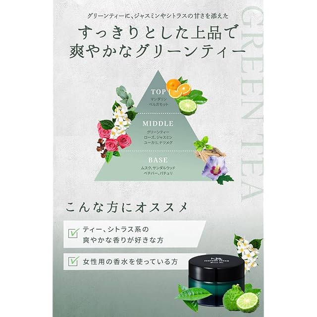【こんな方におすすめ】香水が好きな方 キツイ香りが苦手な方 初めて香水を使う方 敏感肌 男性 女性 メンズ レディース 【こんなシーンにも】出勤前 ビジネスシーン 商談前 打ち合わせ お出かけ デート 就寝前 お風呂上がり【製品名】NULL パヒュームクリーム グリーンティー 【フレグランス】マンダリン ベルガモット グリーンティー ローズ ジャスミン ユーカリ ナツメグ ムスク サンダルウッド ベチバー パチュリ 【分類】化粧品【使用部位】首筋、手首、耳の後ろ、髪、胸元、足首など