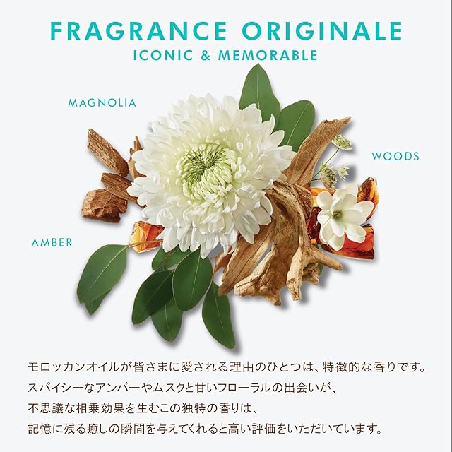 【モロッカンオイルの香り】スパイシーなアンバー(琥珀)と甘いフローラル系のムスクがブレンドされている印象的な香りです。この香りは世界中の人に愛されています。
