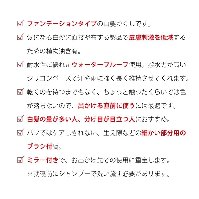 白髪をサッと隠す!お出かけ前に!パフで塗るだけで自然な感じの仕上がりに。細かい部分用のブラシ付。