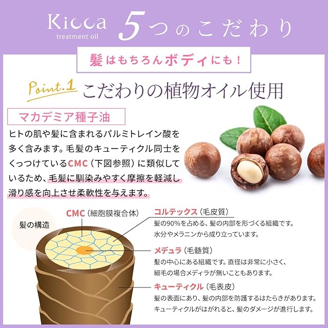 Kiccaシリーズに新登場!髪をはじめ、カラダにも使えるトリートメントオイル。<BR>3種の植物オイル※を配合し、しっとりとした美しい髪に整え、髪になじみやすく、ベタつかない。<BR> さらに、熱反応性毛髪補修成分「Y-ドコサラクトン」を配合し、ハリやコシを与える。ドライヤー、ヘアアイロンなどの熱によりのダメージを補修する。<BR> 5つの無添加※、オレンジとレモンの香りが、爽やかさを引き立てて、心地よい気分にリフレッシュ。<BR>1本で乾いた髪や乾燥の気になるボディにも使えるトリートメントオイル。 オイルのベタベタ感が苦手、髪のうねり・絡まりが気になる方におすすめ。