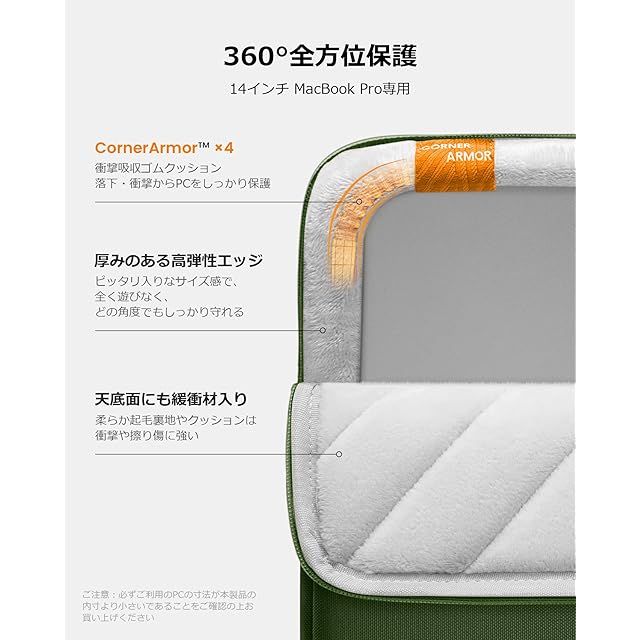 商品名:tomtoc 360°保護 パソコンケース 14インチ MacBook Pro M4/M3/M2/M1 Pro/Max 2024-2021専用 全方位耐衝撃 ノートPCケース スリーブ ラップトップインナーバッグ 軽量 撥水加工 グリーン