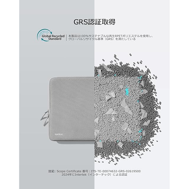 【サステナビリティと品質の融合】 GRS認証(グローバル・リサイクル・スタンダード)を取得したこのノートパソコンケースは、環境に優しい素材と優れたクラフトマンシップを兼ね備えています。撥水加工されたリサイクル生地を使用し、安心のYKKジッパーと柔らかな裏生地が特徴です。何百万本もの廃棄されたプラスチックボトルを再利用して、耐久性と高い機能性を実現したデザインです。tomtoc製品は全て12ヶ月間安心付きます。