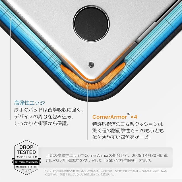 【軍用規格の360°全面保護】tomtocは業界初でノートパソコンの「360°全面保護」を実現しました。四角にある特許取得のゴム「CornerArmor」クッション、PCをフル周る厚手の高弾性エッジやふわふわとしてフランネル裏地の組合せは、超強耐衝撃力でパソコンを衝撃や意外の落下から守り、2020年9月10日に軍用落下試験(規格MIL-STD-810H:2019)をクリアしました。史上初該当規格を満たしたPCケース。