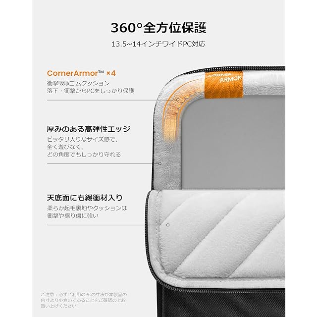 【軍用規格の360°全面保護】tomtocは業界初でノートパソコンの「360°全面保護」を実現しました。四角にある特許取得のゴム「CornerArmor」クッション、PCをフル周る厚手の高弾性エッジやふわふわとしたフランネル裏地の組合せは、超強耐衝撃力でパソコンを衝撃や意外の落下から守り、2020年9月10日に軍用落下試験(規格MIL-STD-810H:2019)をクリアしました。史上初該当規格を満たしたPCケース。 <BR/>【品質と性能の両立】高品質の撥水加工された再生表地や、信頼性の高いYKK製ダブルファスナー、内装の洗練されたライン模様、及びしっかりとした作りでノートパソコンケースの最高レベル達成。環境保護の責任を役たすために、このパソコンケースの表地にプラスチックの再生素材を使用することにより、何十万の廃棄ペットボトルを活用しました。tomtoc製品は全て12ヶ月間安心付きます。 <BR/>【便利なフロントポケット】フロントポケットはKindle、アダプター、ケーブル、マウス、ハブ、USBメモリ、イヤホンなどのPC周辺小物を一気に収納できます。AirTagや鍵掛け用ストラップ付。この軽量でコンパクトなラップトップ保護ケースは他のショルダーバッグ、バックパックに簡単に収納できます。 <BR/>【メディアやお客様からの評判】想像以上の保護力や優れた品質、ピッタリフィットな装着感で、このPCケースは広く高評価されています。Wirecutterより「一番人気のノートパソコンスリーブ ・MacBook Proケース」と褒賞され、さらにNBC Selectより「Select Giftable Tech Awards 2023」を授賞されました。注:Wirecutter :「The New York Times」所属ガジェットレビューメディア。 <BR/>【幅広い互換性】内寸:325 × 232 × 23mm。大部分の13.5-14.4インチノートパソコンに対応。例えば:13.5インチ Surface Laptop | 14.4インチ Surface Laptop Studio | 13.5型 Surface Book、大部分のLenovo/HP/Asus/Dell/NEC Lavie/富士通/dynaboook/Acer/VAIO/mouse/ドスパラ/Panasonic 14型ノートパソコン。対応型番の詳細は下記ページでご確認の上お買い上げください。必ずご利用のPCの寸法が本製品の内寸より小さいであることをご確認の上お買い上げください。