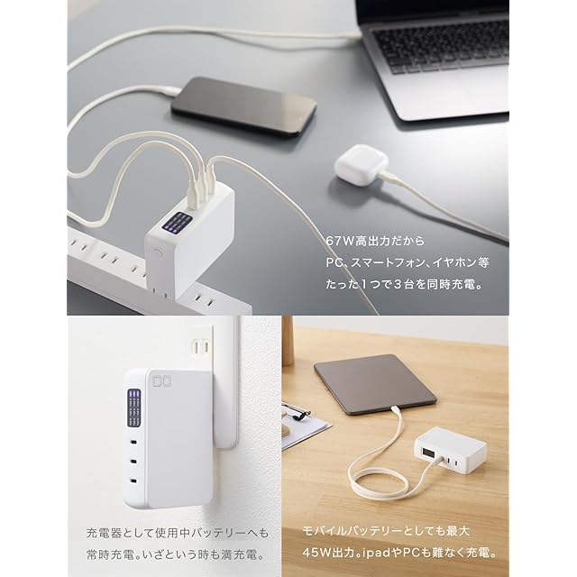 【ACアダプターとモバイルバッテリーが一体化】最大67W出力、タイプCポートを3ポート搭載の急速充電器と、高出力モバイルバッテリーが一体化。コンセントから抜いての使用時も、10000mAhで最大45Wの高出力を実現。外出先でノートパソコンも充電できるモバイルバッテリーです。