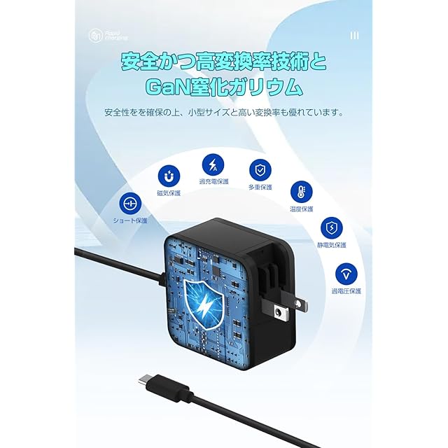 【新素材GaN+の65W USB-C 充電器】新世代のGaN窒化ガリウムが採用され、65Wの高出力しながら、従来のノートパソコン充電器やMacbook付属の純正充電器よりコンパクトなサイズを実現しました。小さいサイズでより高い効率的な充電電力、熱伝導率が大きく放熱性に優れて65Wフルスピード充電が可能です。安心安全のPSE認証を取得済み、過充電保護、過放電保護、過熱防止、漏電保護など各種保護機能を備え、パワフルかつ安全な充電をご提供いたします。