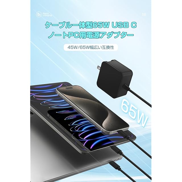 【極小サイズ&ケーブルと一体型】タイプc パソコン 充電器 65Wは最新のGaN(窒化ガリウム)技術を採用し、小さくて高出力の65w usb-c 充電器を実現しました。pd 充電器 65wは従来のシリコン充電器よりも50%以上小さくなります。サイズは5cm*5cm*3cm、ケーブルを合わせる重さは僅か129g、通常の65w充電器よりサイズが50%以上小さくなりました。手のひらに収まるほどで、ACプラグも折り畳める設計のため、小さいに収納できて持ち運び便利です。