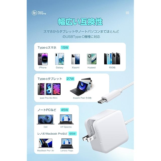 【幅広い互換性&27W/45W/65W】Power Deliveryの技術により、お使い機器を接続した場合、接続されているデバイスの種類を自動検知し、お使い機器を最適な出力で急速充電が可能です。入力:100-240V 50-60Hz 1.5A; 出力65W: 5V 3A, 9V 3A, 12V 3A, 15V 3A, 20V 2.25A, 20V 3.25A, PPS: 3.3-21V/3A。PD対応の45W/65W タイプc充電器を備え、ノートパソコンからタブレット、スマートフォンまで幅広いType-c機器に急速充電できます。