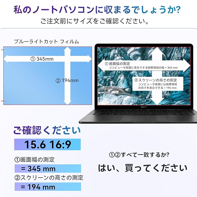 【ワイド適応】幅: 13.57インチ (344.7 mm)、高さ: 7.64インチ (194 mm)、対角: 15.6インチ (396.2 mm)。HP Lenovo、Dell、Acer、Asus、Samsung Envyなどの15.6インチノートパソコンと互換性があり、視力を保護し、目の疲れを防ぐ必要がある近視の人、学生、オフィスワーカー、オンラインゲームプレーヤーなどに最適です。ご注文前に、画面の幅と高さの測定値を確認してください。画面の対角サイズのみに基づいて選択することはお勧めしません。