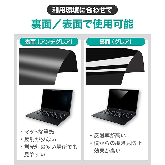 [ リバーシブル ] 表面はマットな質感で反射が少なく蛍光灯の多い場所でも見やすいアンチグレア面(反射防止加工・非光沢)、 裏面は反射率が高くサイドからの覗き見防止効果が大きいグレア面(光沢)です。ご利用環境に合わせてご利用いただくことができます。