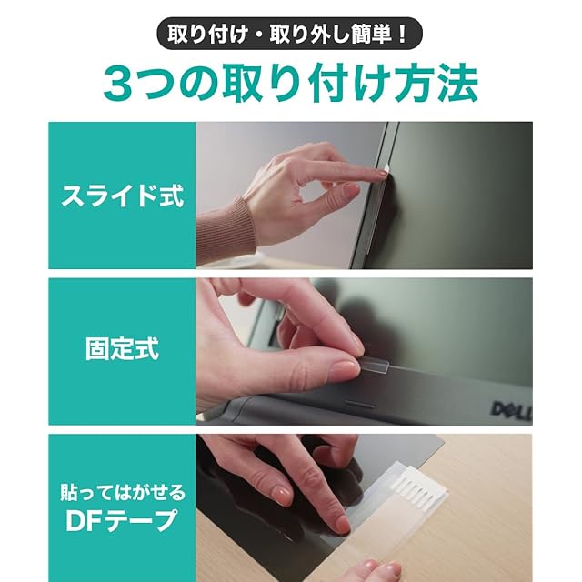 [ 装着方法 ] 画面に段差があるフレームベゼルタイプには<スライド式>または<ベゼル固定方式>を、段差のないフレームレスの液晶画面には<直張り方式>を推奨。 お持ちのパソコンに合わせて固定用プレートまたは両面シールを貼ってのぞき見防止フィルムをご利用ください。