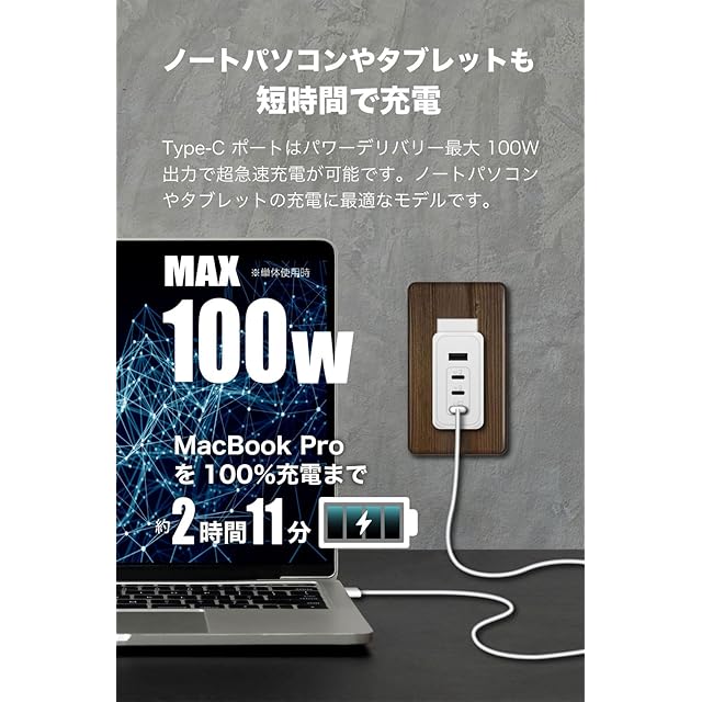 急速充電PD100W対応 AC充電器。ポート:USB-C(Power Delivery)×3、USB-A×1 を装備。ACプラグ90度回転し格納可能です。W32.5xH62xD63mmのコンパクトサイズ、重量も約230gと軽量化を実現。 ノートPCの充電にも対応【単ポート最大100W出力】USB-C単ポート最大出力100W PD規格準拠でApple Macbook ProやWindowsノートパソコンへの充電に最適な充電器です。スマートフォンからタブレット(iPad向け)、ノートPC(Macbook、Windows PC等)まで幅広い機器に対応しています。 【合計4ポート搭載】USB-C×3ポート、タイプA×1ポート搭載。USB-C 2ポート使用時は65WのノートPC+30Wのスマートフォン を同時に、4ポート使用時は合計最大90Wの範囲で同時充電が可能です。スマートフォン(iPhoneやAndroid)からタブレット(iPad)、ノートPC(Macbook、Windows PC等)まで幅広い機器に対応しています。※詳しくはUSBポートの最大出力表(画像)をご確認ください。 【PPS対応】対応機器にあった最適な電力を供給することで電力変換効率が向上。給電中の『エネルギーロス』による発熱を抑制できるメリットがあります。 【海外旅行でも使用可】 AC100V~240V対応のため、海外でも使用可能。旅行や出張の際にも便利です。 【保護機能付】 充電時に過充電・過電圧を防止、ショートした際には動作を中止する短絡保護機能を搭載。難燃PC素材を使用しています。