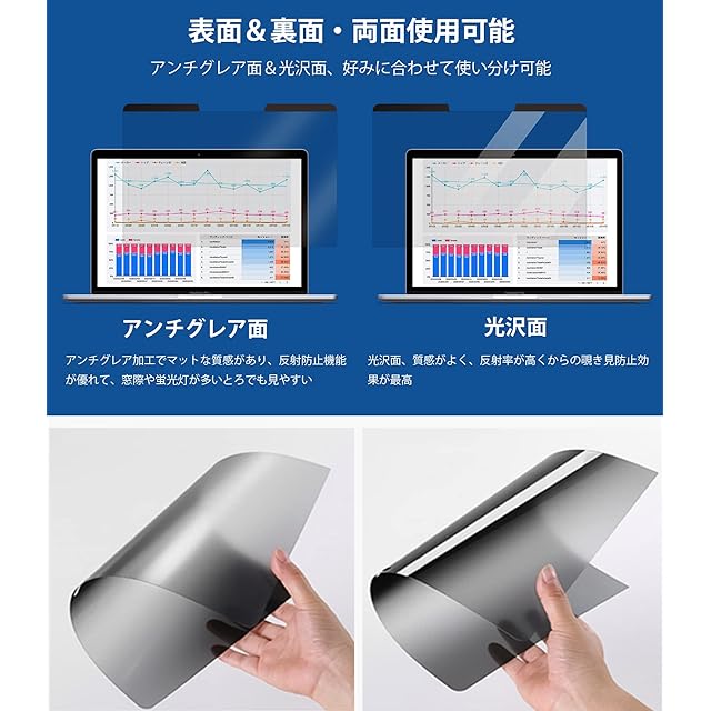 ✅【両面使用可能】片面はアンチグレア加工で太陽や蛍光灯などの光による反射を軽減し、画面を見やすくなります。もう片面は反射率が高くて、光沢がありますので、覗き見防止効果が高く、画面のツヤも損なわなく、美しく表示します。両面は使用環境や用途に応じて、自由に使い分けることができます。