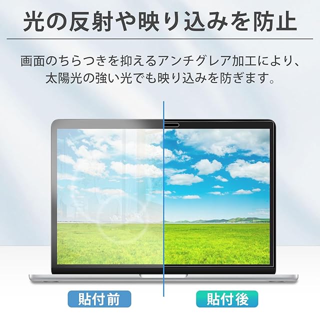 ★強い光による反射を抑え、画面が見えやすくなる超反射防止加工を施したブルーライトカットタイプの液晶保護フィルムです。【超反射防止】:ライトの反射や映り込みを低減し、ギラつきが無くなり画面が見やすくなります。