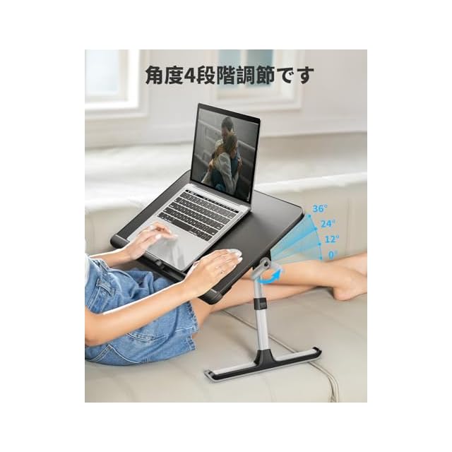 高度・角度調整:高さは5段階調整:24~33cm、角度は4段階:0~36°調整できます。天板の下広い空間がある両脚が自由に動けます。
