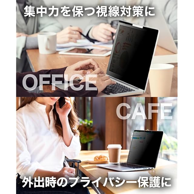 [プライバシー保護] 視野角 60度、正面から見れると画面はクリアでも、隣の席からは真っ暗に映る偏光性を有する「覗き見防止フィルター」です。