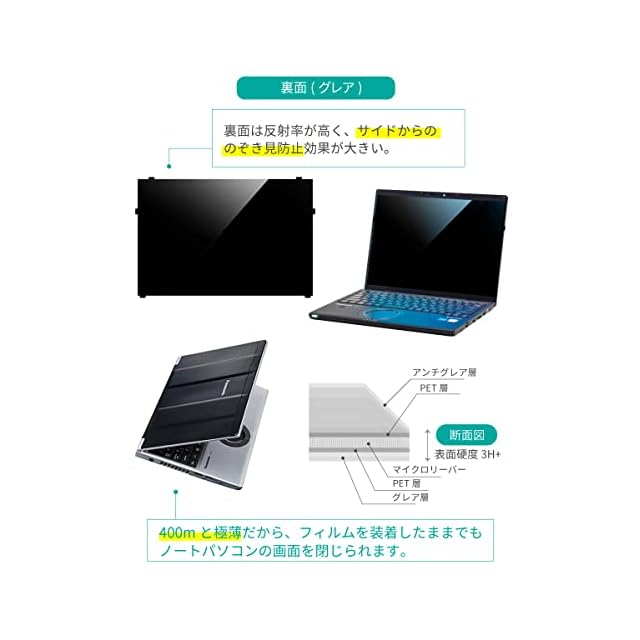 [ リバーシブル ] 表面はマットな質感で反射が少なく蛍光灯の多い場所でも見やすいアンチグレア、 裏面は反射率が高くサイドからの覗き見防止効果が大きいグレアタイプ。ご利用環境に合わせて付け替えができます。