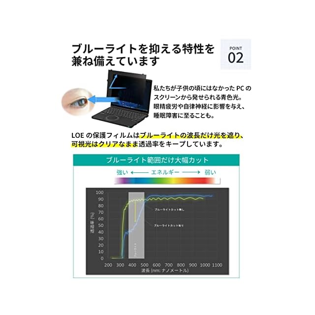 [ ブルーライト半減 ] 私たちが子供の頃にはなかったノートパソコンのスクリーンから発せられる青色光。 毒性の強いブルーライトは眼精疲労や体内リズムへの影響が益々懸念されています。 本製品はブルーライトを約50%低減。将来のことを考えるならブルーライトカット対応フィルムがオススメです。反射率5.8%とアンチグレアで光の映り込みもほとんどありません。